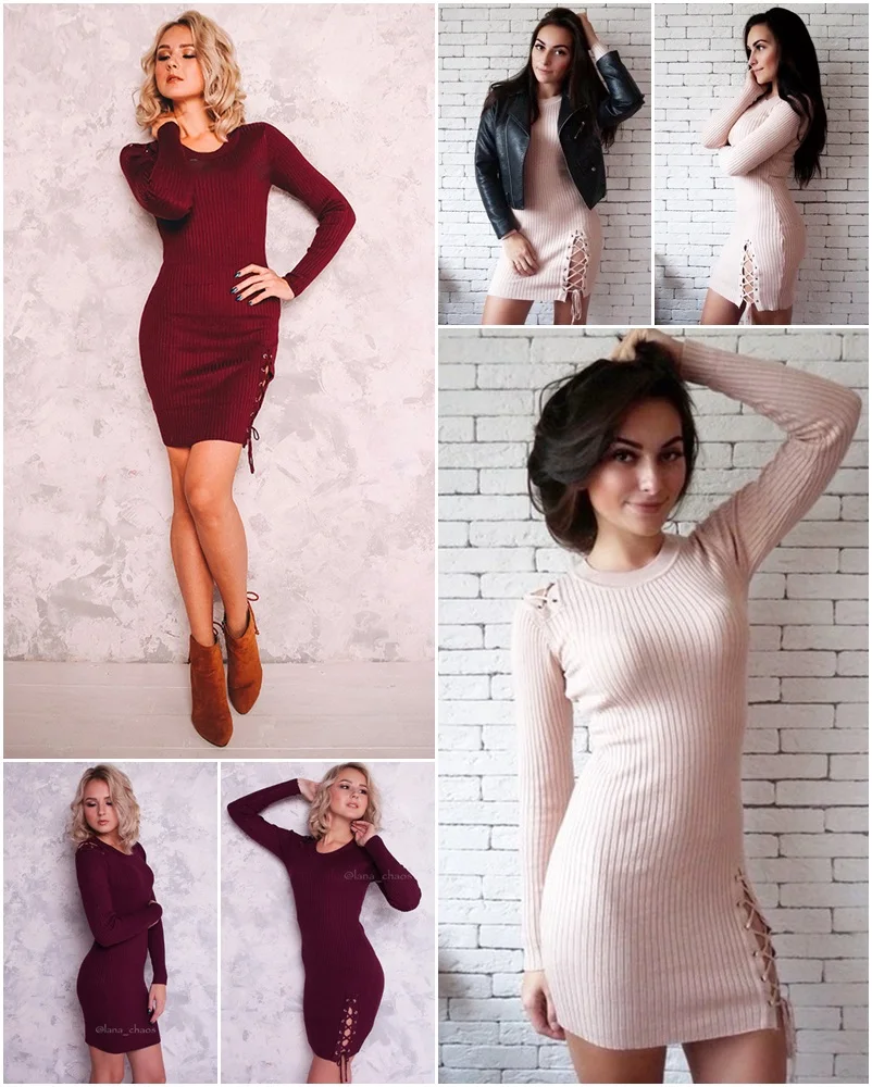 Dzianinowa, prążkowana sukienka z wiązaniami na ramieniu i udzie. Elastyczny materiał łatwo dopasowuje się do figury i podkreśla kształty.